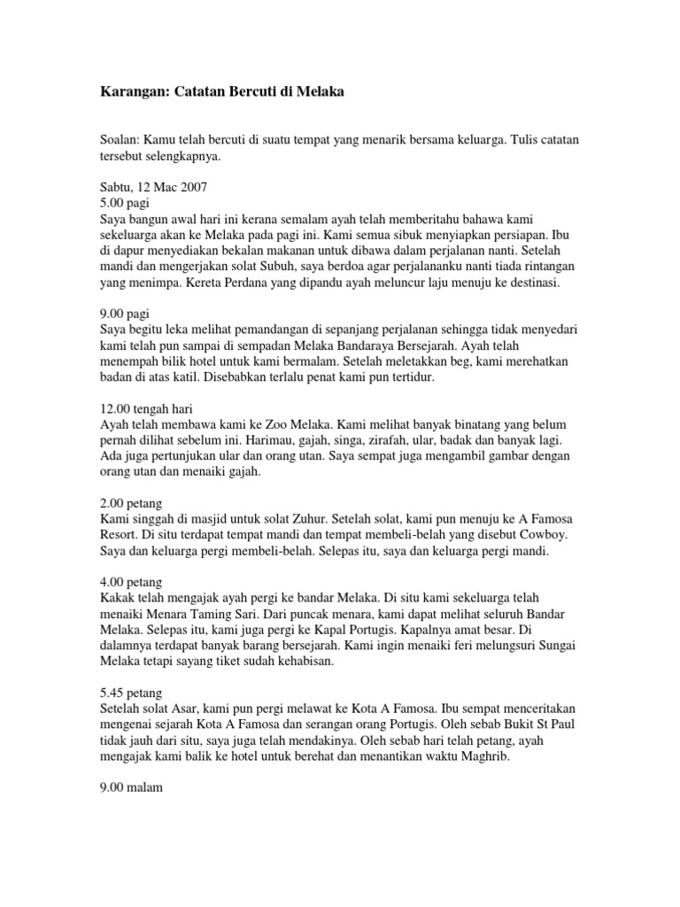 Contoh karangan bi tentang percutian melaka. Pada pukul 1100 pagi kami telah bertolak menuju ke destinasi kami. 600 pagi -Kami bersiap-siap untuk pergi bercuti ke Melaka.